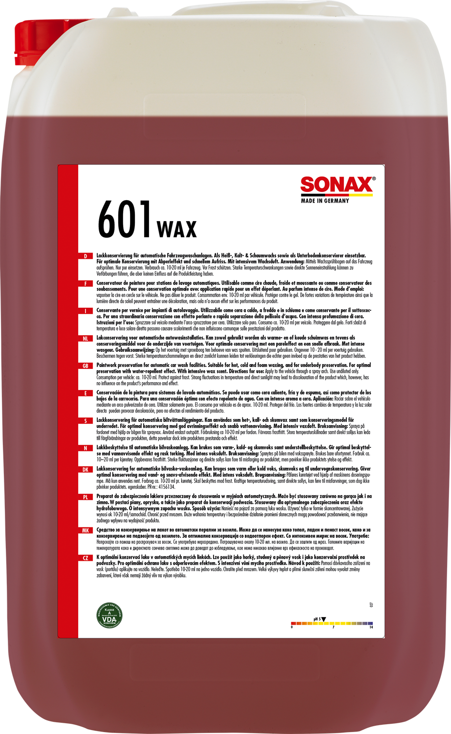 SONAX WAX, Auto Vaska koncentrāts. Piemērots lietošanai kā karstais vasks, auksts vasks, putu vasks un kā auto apakšas pārklājums. Optimālai krāsu saglabāšanai automātiskajās mazgāšanas iekārtās ar karstā vaska sistēmām. Augsta atspīduma aizsargplēve ātri pārklāj visu transportlīdzekļa virsmu, lai nodrošinātu perfektu visaptverošu aizsardzību un ūdens atgrūšanas efektu. Atvieglo žāvēšanu. Lietot atšķaidītu. Ph 5. 25L.