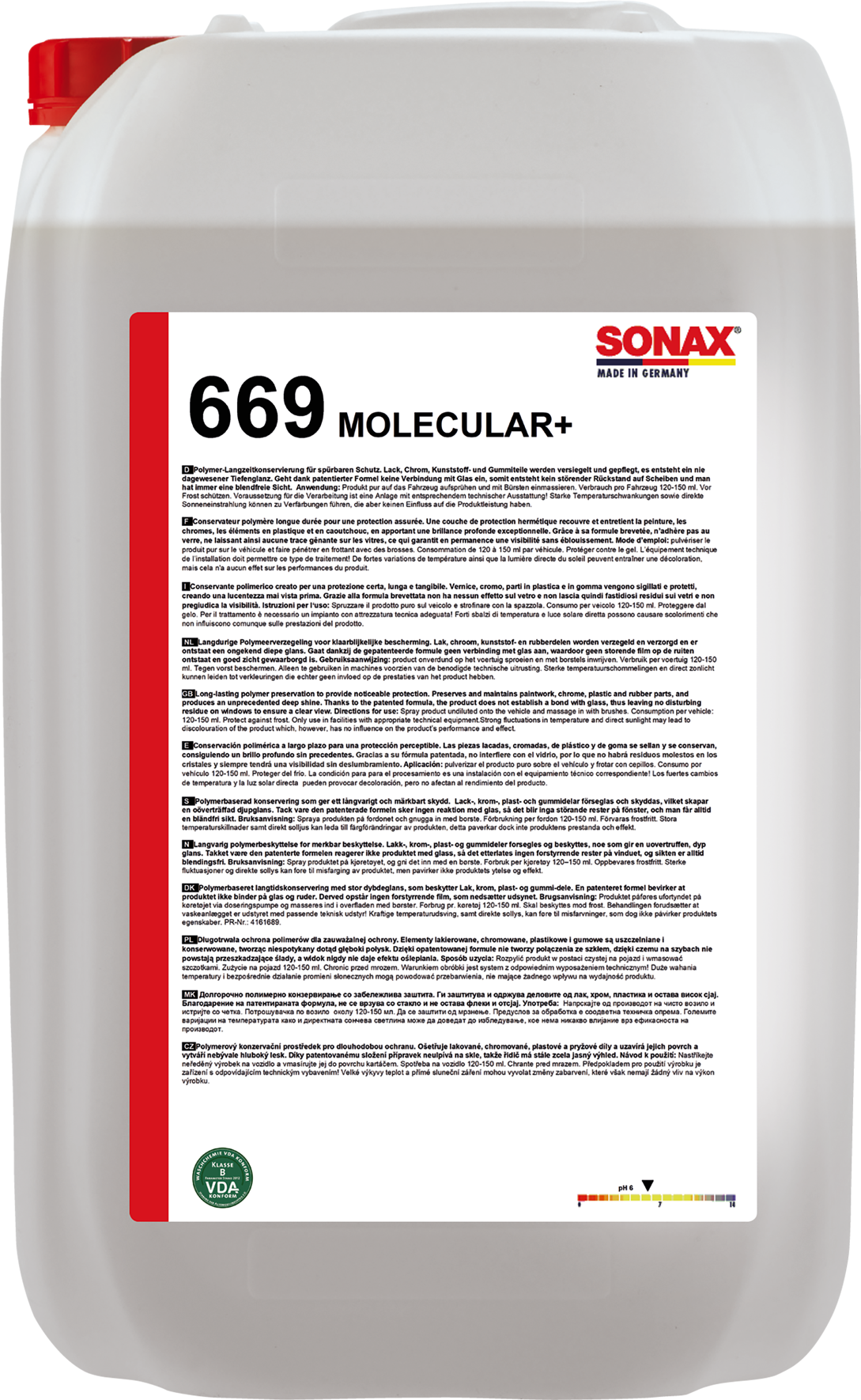 SONAX Molecular+ InteliWash, Tīrīšanas līdzeklis. Polimerizēta automātisko automašīnu mazgāšana ar ilgstošu saglabāšanu. Sablīvē krāsu, hromu, plastmasas un gumijas detaļas un piešķir tiem ļoti dziļu spīdumu. Pateicoties patentētajai kompozīcijai, produkts neapvienojas ar stiklu, tāpēc uz priekšējā stikla nepaliek atliekas un skats vienmēr ir skaidrs. Patēriņš uz 1 auto 120-150 ml. Lietot atšķaidītu. Ph 6. 25L.